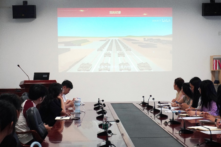 随后,全体与会党员共同观看了纪律教育主题片。王思聪围绕政治纪律、组织纪律、廉洁纪律、群众纪律、工作纪律、生活纪律等方面提出明确要求,强调新生党员要在科研学习与日常生活中严于律己,做合格党员。